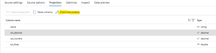 If you notice, the last row contains data for numeric data types as well. To ensure ADF reads numeric and decimal values correctly, I clicked on the "overwrite schema" button in the data flow source and reselected the same decimal data type, as ADF converts numeric data types to decimal.
