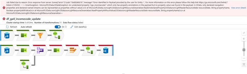 Job failed due to reason: Error response from server: Some({"error":{"code":"0x80048d19","message":"Error identified in Payload provided by the user for Entity :'', For more information on this error please follow this help link https://go.microsoft.com/fwlink/?linkid=2195293 ----> InnerException : Microsoft.OData.ODataException: An undeclared property 'ngo_incomecode1' which only has property annotations in the payload but no property value was found in the payload. In OData, only declared navigation properties and declared named streams can be represented as properties without values.\r\n at Microsoft.OData.JsonLight.ODataJsonLightResourceDeserializer.ReadUndeclaredProperty(IODataJsonLightReaderResourceState resourceState, String propertyName, Boolean propertyWithValue)\r\n at Microsoft.OData.JsonLight.ODataJsonLightResourceDeserializer.ReadPropertyWithoutValue(IODataJsonLightReaderResourceState resourceState, String propertyName)\r\n at Microsoft.OData.JsonLight.ODataJsonLightResourceDeserializer.<