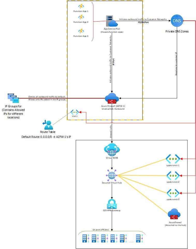 Attached is a network diagram of our current setup. The function apps (in VNet-1) initiate a connection(s) to a specific IP:Port or FQDN:Port in the on-premises network(s). A Private DNS zone ensures that any FQDN is resolved to the correct internal IP address of the on-prem endpoint. In our setup, both the function app and the external firewall reside in the same VNet. This firewall is described as “Unattached” because it is not the built-in firewall of a secured vWAN hub, but rather an independent Azure Firewall deployed in that VNet. The VNet has a user-defined default route (0.0.0.0/0) directing all outbound traffic to the firewall’s IP. The firewall then filters the traffic, allowing only traffic destined to whitelisted on-premises IP: Port or FQDN: Port combinations (using IP Groups), and blocking everything else.