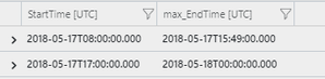 datatable(StartTime:datetime,EndTime:datetime)[ datetime("2018-05-17T08:11:00.00"), datetime("2018-05-17T15:33:00.000"), datetime("2018-05-17T08:11:00.00"), datetime("2018-05-17T15:45:00.000"), datetime("2018-05-17T08:13:00.00"), datetime("2018-05-17T15:47:00.000"), datetime("2018-05-17T08:13:00.00"), datetime("2018-05-17T15:49:00.000"), datetime("2018-05-17T08:09:00.00"), datetime("2018-05-17T15:43:00.000"), datetime("2018-05-17T17:34:00.00"), datetime("2018-05-18T00:00:00.000")] | summarize max(EndTime) by bin(StartTime, 1tick)- Prashant SharmaNov 27, 2018Brass Contributor