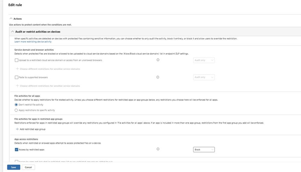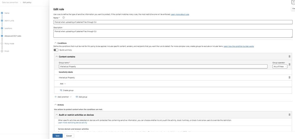 - Then I created a policy that is applied to my machine and my user to block the move and upload of data that is labelled as Intellectual Property (Sensivity Label)