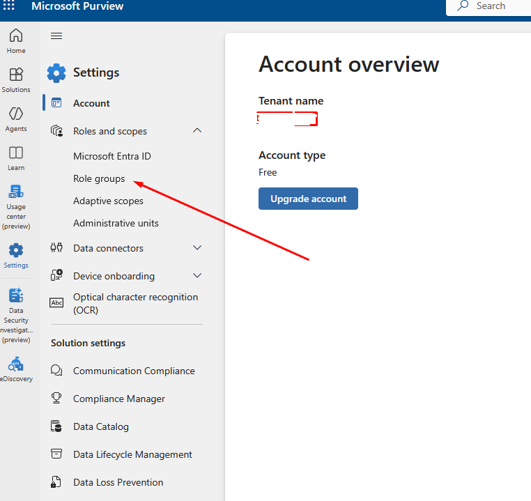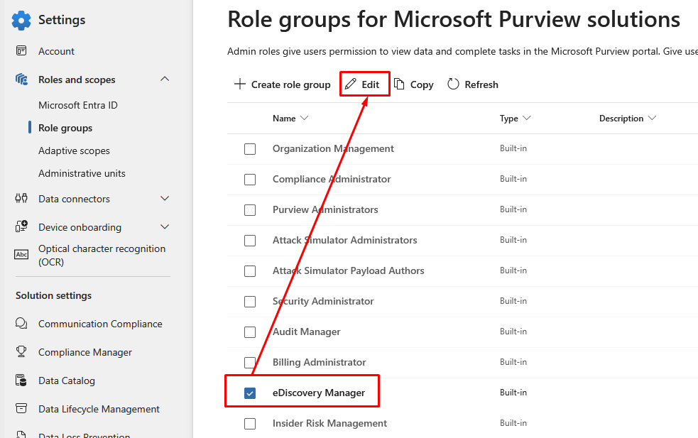 3. On the Role groups for Microsoft Purview solutions screen, scroll down and check the box next to eDiscovery Manager, then click the Edit button at the top.