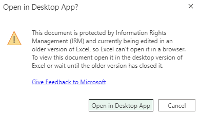 Unable to open IRM protected document in Excel Online