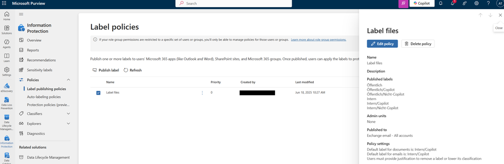 Was muss im MS Purview einstellen damit ich auch diese Vertraulichkeitsbezeichnung
