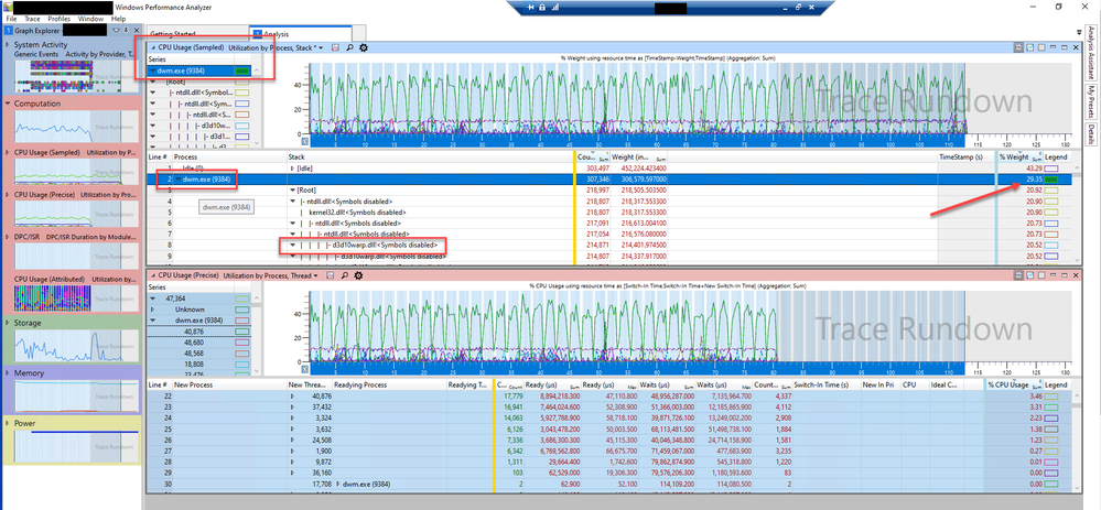 When doing a CPU trace via Windows Performance Analyzer, we see that DWM.exe is using all this CPU via d3d10warp.dll.