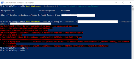 Hallo, I become the erorr "New-RdsTenant : User is not authorized to query the management service." I like to try windows virtual desktop. So I create a complete new azure tenant for testin...