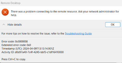 Our MSRDC Clients have been experiencing issues launching desktops getting stuck on "securing remote desktop connection". Eventually the client will time out with the below error, but nothing is logged in AVD Insights for the attempted connection and subsequent failure.