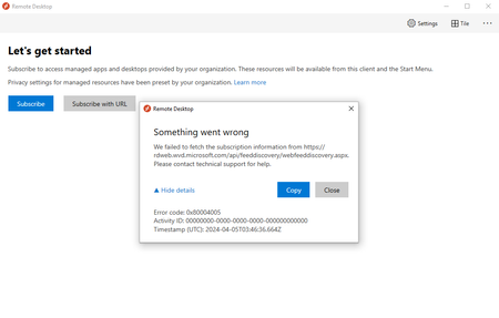 Hi all, Facing this issue when attempting to subscribe to the Remote Desktop client https://learn.microsoft.com/en-us/azure/virtual-desktop/users/connect-windows?pivots=remote-desktop-msi ...