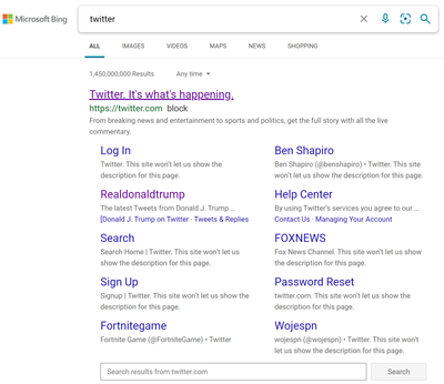 Hi Deleted! The deeplinks, the additional Twitter accounts under the original search result "Twitter", on Microsoft Bing are algorithmically driven and can change frequently. It's even possible for these types of results to shift daily depending on what Twitter accounts people are interacting with most.