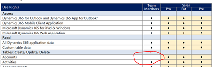 When you review the full list of use rights, you'll find that both Sales & Customer Service read the same for use rights to create, update, and delete a table for an account: