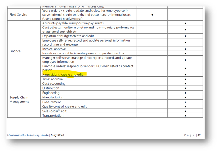 To confirm,pg. 38 summarizes rights for all operations licenses while Appendix C breaksdown the individual licenses (Commerce & Finance) that includes the ability to create and edit requisitions:
