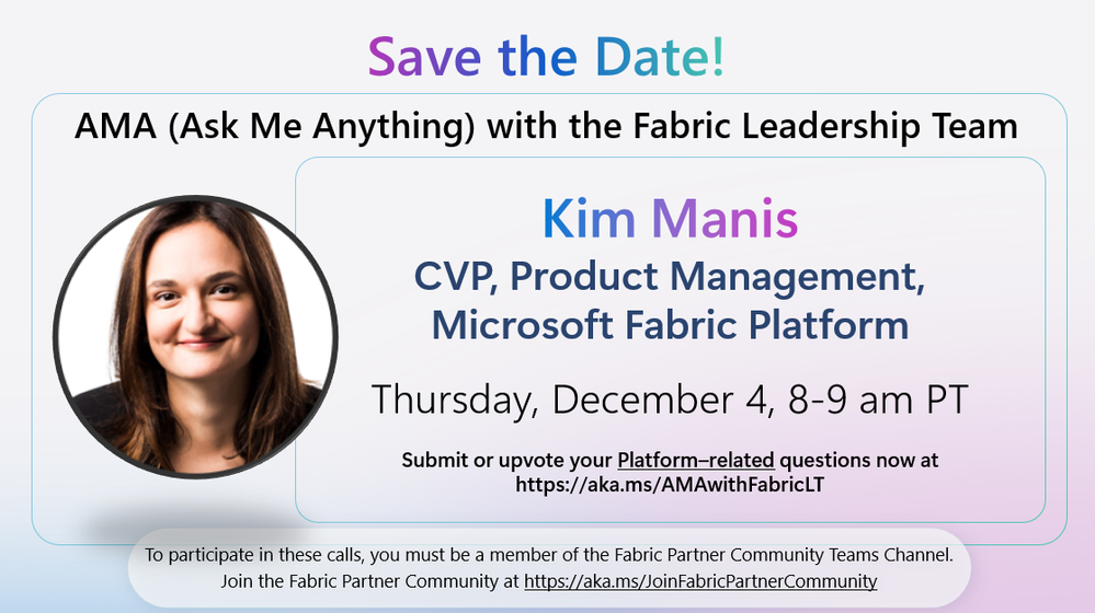 ๐ Exciting News for the Fabric Partner Community! ๐ Join us for a special AMA (Ask Me Anything) session with the Fabric Leadership Team, featuring Kim Manis, CVP of Product Management for Microsoft Fabric Platform! This is your chance to connect directly with the leaders shaping the future of Microsoft Fabric, ask your platform-related questions, provide feedback, and gain insights into upcoming innovations.