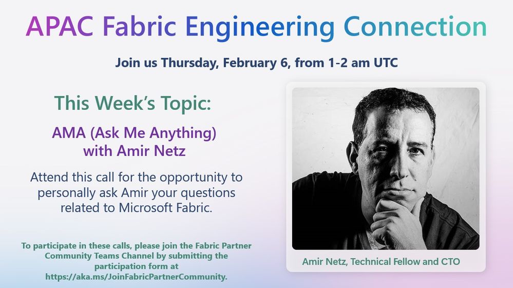 Amir Netz will be hosting his very first AMA (Ask Me Anything) session with the APAC Fabric Engineering Connection call, taking place Thursday, January February 6, from 1-2 am UTC/Wednesday, February 5, from 5-6 pm PST. Join the call to personally ask Amir your Fabric related questions!