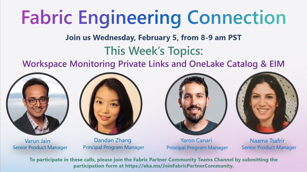 The Fabric Engineering Connection call, taking place Wednesday, February 5, from 8-9 am PST, will feature Varun Jain and Dandan Zhang presenting on Workspace Monitoring and Workspace Private Links.