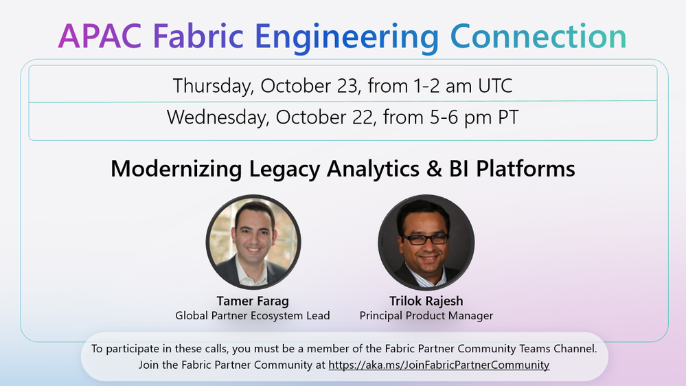 The APAC call is Thursday, October 23, from 1-2 am UTC/Wednesday, October 2, from 5-6 pm PT. Tamer Farag and Trilok Rajesh will be presenting on Modernizing Legacy Analytics & BI Platforms.