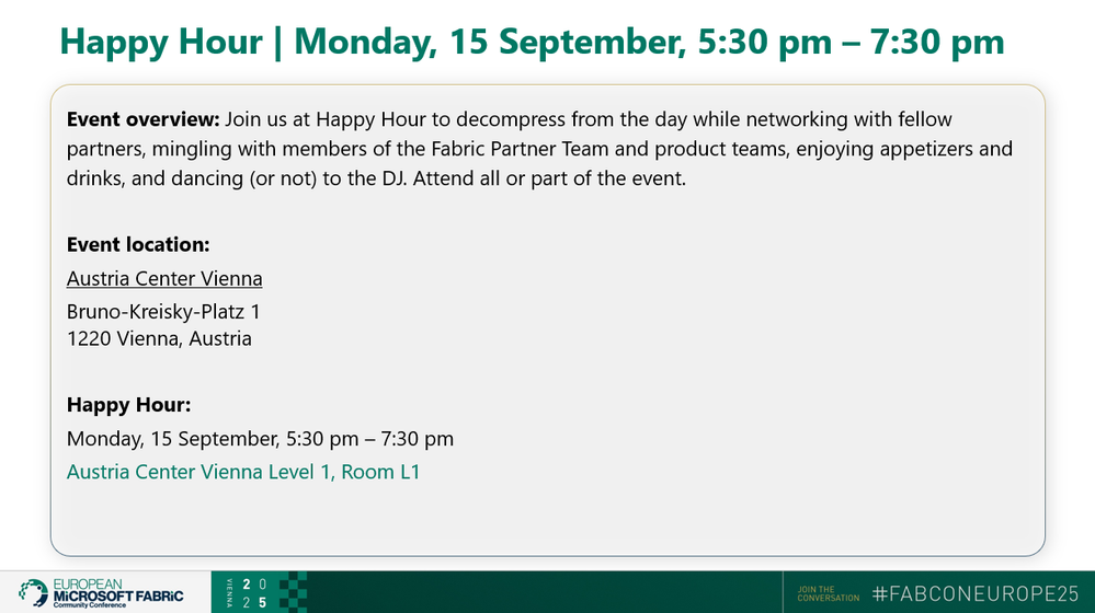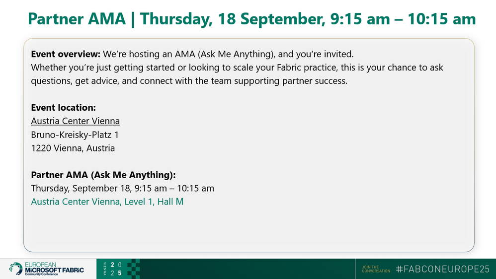 We can’t wait to see you at FabCon Europe 2025, taking place 15-18 September at the Austria Center Vienna in Vienna, Austria! With more than 130 expert-led sessions over three days, plus workshops 15 September, this is the largest Microsoft tech conference in Europe!
