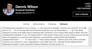 The following has evaluated to null or missing: ==> user.view_href [in template "common-user-macros.ftl" at line 586, column 77] ---- Tip: It's the step after the last dot that caused this error, not those before it. ---- Tip: If the failing expression is known to be legally refer to something that's sometimes null or missing, either specify a default value like myOptionalVar!myDefault, or use <#if myOptionalVar??>when-present<#else>when-missing. (These only cover the last step of the expression; to cover the whole expression, use parenthesis: (myOptionalVar.foo)!myDefault, (myOptionalVar.foo)?? ---- ---- FTL stack trace ("~" means nesting-related): - Failed at: ${user.view_href} [in template "common-user-macros.ftl" in macro "getUserName" at line 586, column 75] - Reached through: @getUserName following [in template "custom.user.profile-followers-following" at line 60, column 41] ----