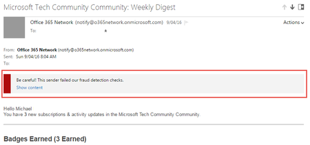 In Outlook.com: Fraud alert message for Tech Community email notifications