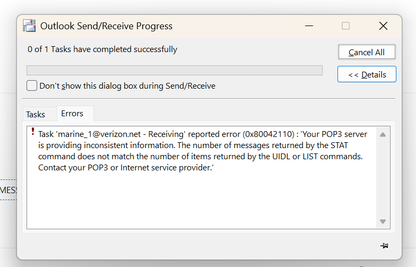 Task 'email address removed for privacy reasons - Receiving' reported error (0x80042110) : 'Your POP3 server is providing inconsistent information. The number of messages returned by the STAT command does not match the number of items returned by the UIDL or LIST commands. Contact your POP3 or Internet service provider.' I've created a new profile, I've done SCANPST probably more than 5 times, regenerated my third party password on AOL and it consistently fails for the same error. I've run the same version of Outlook on a different machine with th same results. My pop settings are pop.verizon.net, port 995, ssl/tls. The progress window shows that it's downloading messages but it sits there for a couple of minutes and then pops the error up;