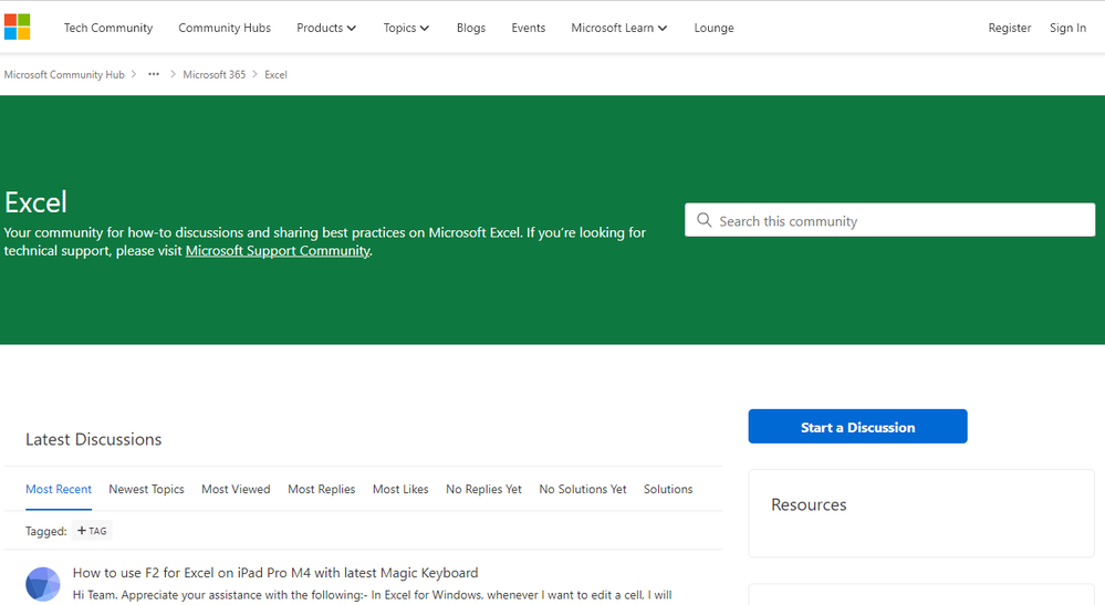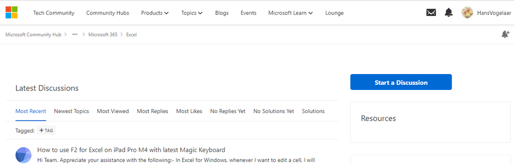 This is the Excel space (https://techcommunity.microsoft.com/category/microsoft365/discussions/excelgeneral) when I'm logged out (using Firefox, fully updated):
