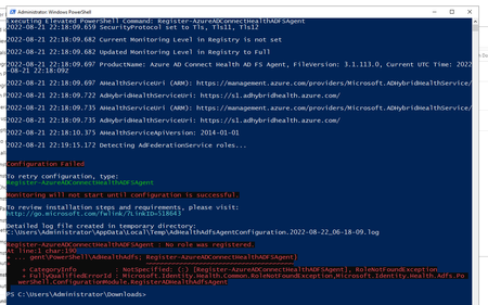 - PradeepDeivaSep 15, 2022Copper Contributoryes , can u try registering it .." azureadconectionhealthadfsagent " but in a slightly different way , this time with the credentials.. run the Register-AzureADConnectHealthADFSAgent Cmdlet with -Credential