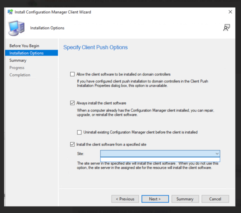 Hi, make sure the “Helpdesk” role has read/write permissions on Site and Client Push Installation. Confirm the Security Scope covers both the collection and the Site object. If the site isn’t accessible, the dropdown will be empty. Compare the “Helpdesk” role settings with “Full Administrator” to identify any missing permissions.