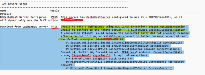 1. I ran "DeliveryOptimizationTroubleshooter" It is showing below unable to make WebRequest using MCC link over port 80 under "MCC DEVICE SETUP"