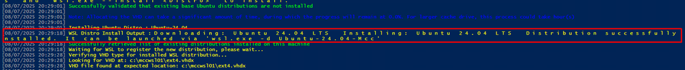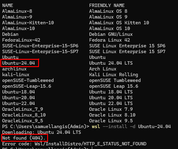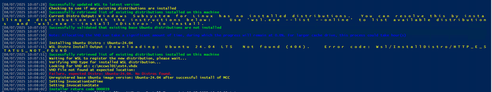 - WSL update to 2.5.10 is interrupted with an error code: Wsl/UpdatePackage/0x80072eff but the script continues, looks for a non-existent VHD file and fails.