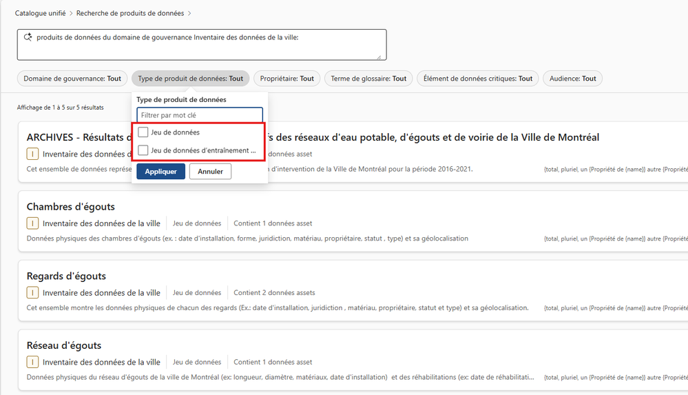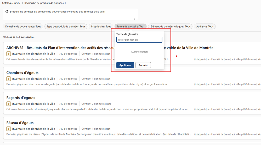 Cependant, je ne vois pas d’option (ou elle ne retourne aucun résultat) pour filtrer les résultats de recherche des produits de données par termes de glossaire, contrairement à d’autres filtres disponibles (ex. Propriétaire, Type de produit).