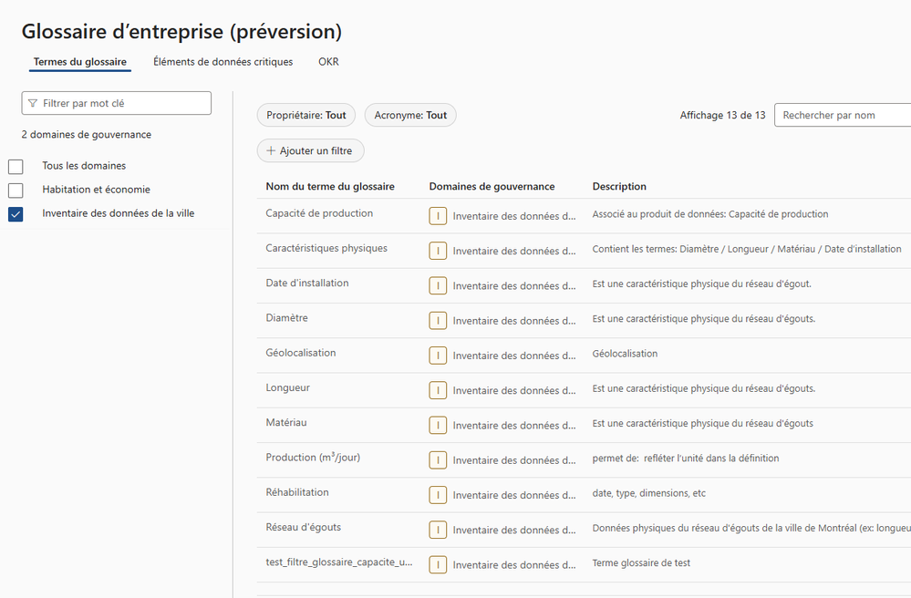 - Les termes de glossaire sont publiés et visibles dans l’onglet Découverte → Glossaire d’entreprise.