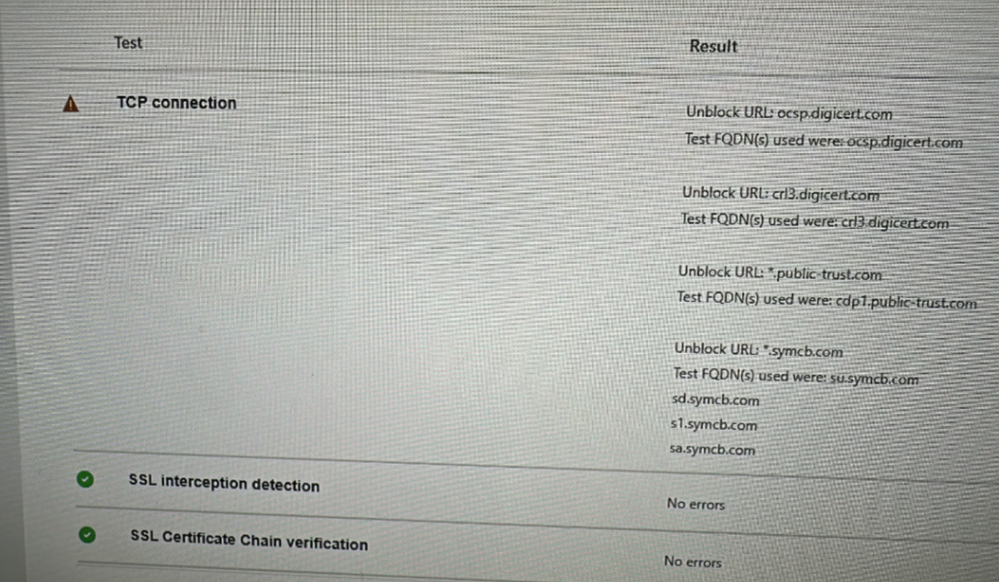 My team has spent the last 2 business days trying to get the https://connectivity.office.com/ TCP connection test to complete successfully to appease the Microsoft Unified Support Team.  They don't want to take our MS Teams crash diags until they see SSL Interception Detection and TCP connection tests passing successfully.