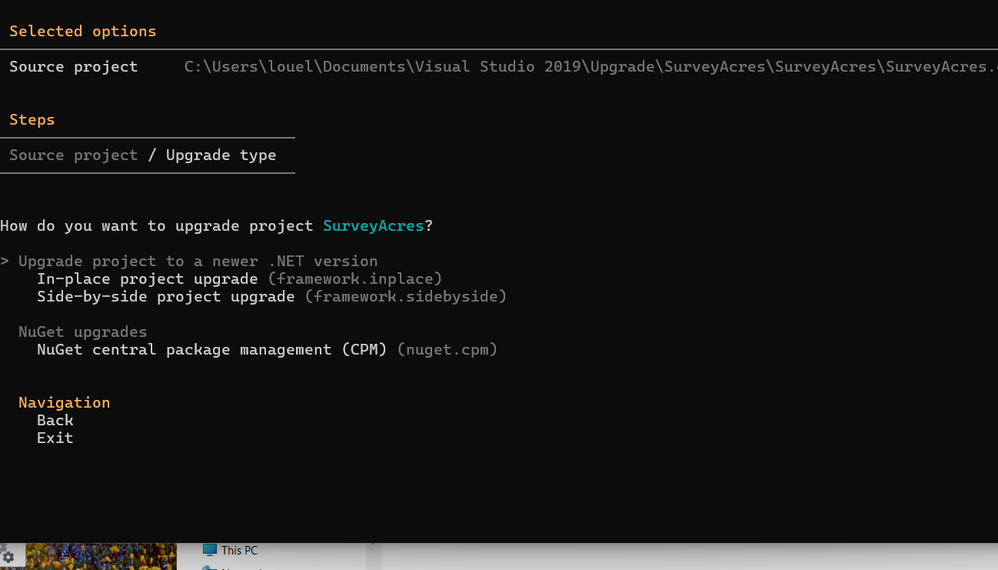 Bear with me please, I have not touched this stuff in a few years. Trying to upgrade Xamarin project to .Net Maui using CLI (latest version of VS 2022 cannot find the Upgrade assistant extension). I have downloaded the upgrade-assistant, but am not familiar with how to reply\how to make a selection of what is displayed after I enter "upgrade-assistant upgrade project-name" (it does not execute and instead displays information...see attached image). Is what is being display telling me that I need to ctrl-c out of this and re-enter the command using what they are showing? Please give me an example of using the Side-by-side upgrade. Is is also telling me that I need to do something with NuGet also on the command line? Thanks.
