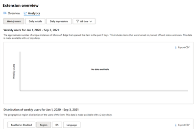 For each extension, one can track the extension’s performance under the ‘Analytics’ tab on the extension’s page. There are three types of data fields available for an extension, each with a set of various other filters such as distribution against region, OS, and language. The data fields available are: Weekly users, Daily installs, and Daily impressions.
