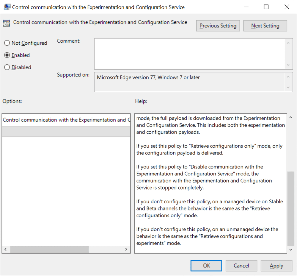 - Open the policy "Control communication with the Experimentation and Configuration Service" policy.