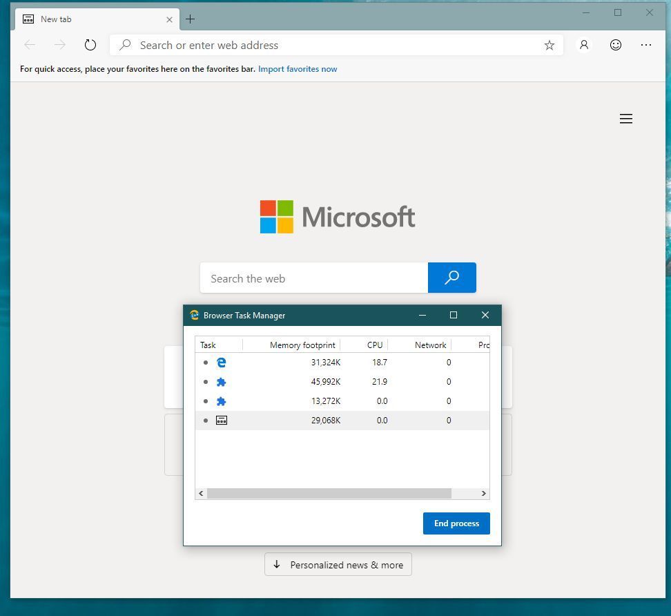 In each case, over a period of 15 +/- minutes of watching Task Manager, an identical pattern appeared that was both persistent on each computer and consistent between the computers: Edge Chromium used 1-1.5% of CPU resources when in the static state described, but neither Edge (Classic) nor Firefox Quantum used CPU resources in the static state described. This snapshot from the Dell XPS 8920 illustrates what I observed:A caveat: I checked several similar Task Manager screenshots (comparing Edge (Classic) and Edge Chromium, but not Firefox) that I used in a discussion related to Chromium-based process handling. At the time I was using an earlier Dev build (I don't recall which, but I think that it was the first Dev release). I saw similar results in snapshot form (that is, Edge Chromium using 1-1.2% of CPU at rest, Edge (Classic) at 0%). The screenshots from that time suggest that the CPU use pattern is not new with the most recent builds.
