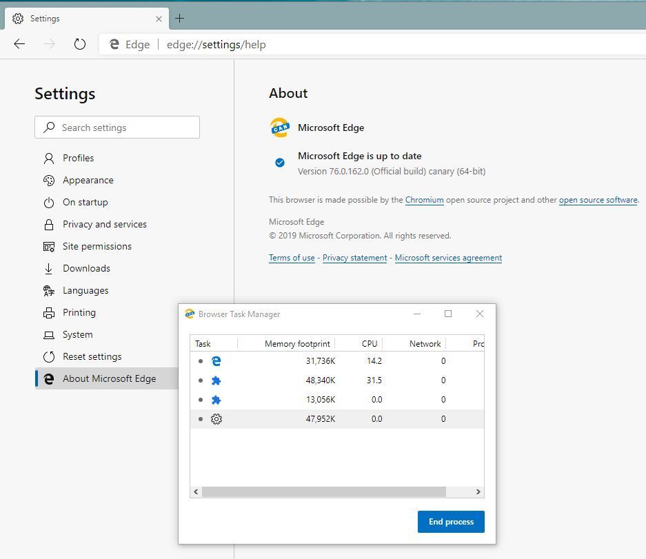 Can someone post Browser Task Manager screenshot confirming that? We need to move on with testing, but some folks already uninstalled Edge.