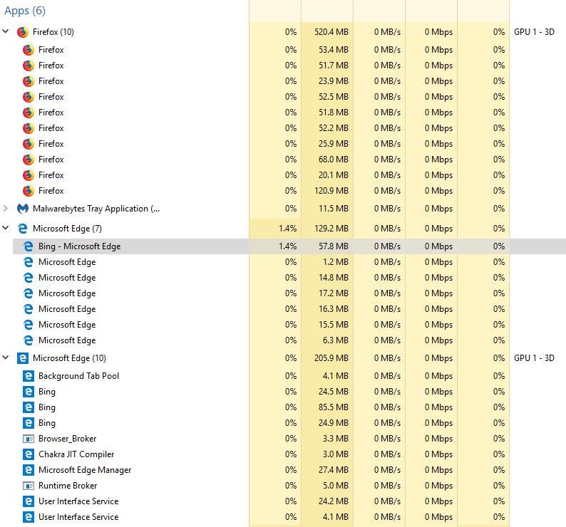 I was comparing Edge vs Brave and I noticed that Edge uses about 30-50% of my CPU in Browser task manager (both browser and gpu) while Brave uses less than 10% combined.