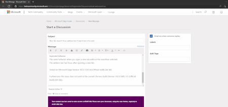 Hello, if you open a new tab with Ctrl+T while the current focus is on the Ctrl+F searchbar, the Microsoft searchbar on the new tab will be selected which uses Bing by default instead of the addr...
