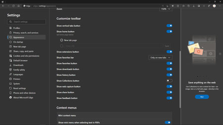 that's why the Collections panel should be visible and accessible. in fact, there isn't a way to disable Collections in Edge, it's a core functionality of the browser.