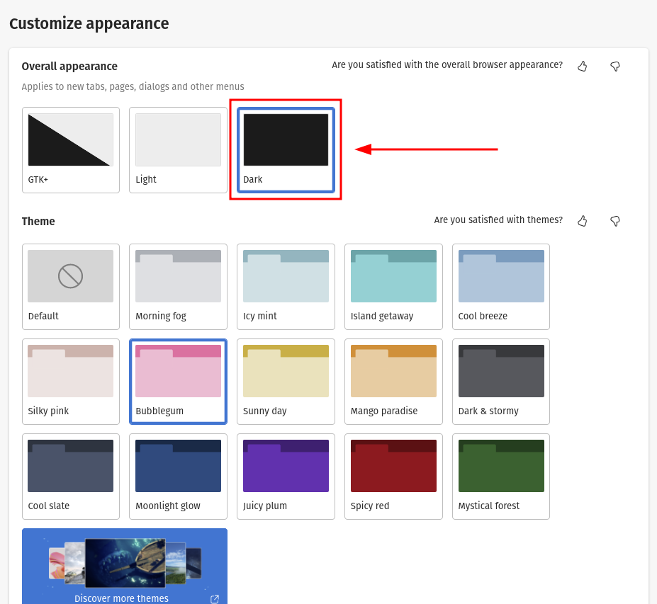 The settings menu, and all sites that automatically change to a dark theme when they detect the browser has that set, remain in their light themes.