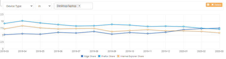 Edge has finally become the second most used browser, according to https://www.netmarketshare.com/browser-market-share.aspx?options=%7B%22filter%22%3A%7B%22%24and%22%3A%5B%7B%22deviceType%22%3A%7B%22%24in%22%3A%5B%22Desktop%2Flaptop%22%5D%7D%7D%5D%7D%2C%22dateLabel%22%3A%22Custom%22%2C%22attributes%22%3A%22share%22%2C%22group%22%3A%22browser%22%2C%22sort%22%3A%7B%22share%22%3A-1%7D%2C%22id%22%3A%22browsersDesktop%22%2C%22dateInterval%22%3A%22Monthly%22%2C%22dateStart%22%3A%222018-05%22%2C%22dateEnd%22%3A%222020-03%22%2C%22plotKeys%22%3A%5B%7B%22browser%22%3A%22Firefox%22%7D%2C%7B%22browser%22%3A%22Edge%22%7D%2C%7B%22browser%22%3A%22Internet%20Explorer%22%7D%5D%2C%22segments%22%3A%22-1000%22%7D