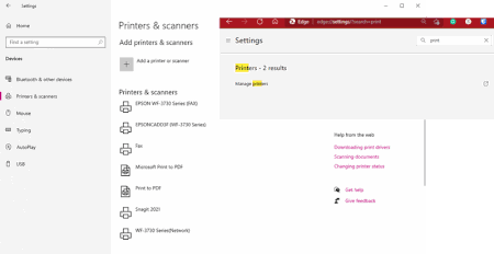 Settings in Edge does not recognize installed printers. Settings search dialog says there are 2 results, but does not list them. Manage printers link does not cause any action. Image shows Edge setti...