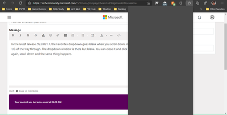 In the latest release, 92.0.891.1, the Favorites dropdown goes blank when you scroll down, in mine, about 1/3 of the way through. The dropdown window is there but blank. You can close it and click to...