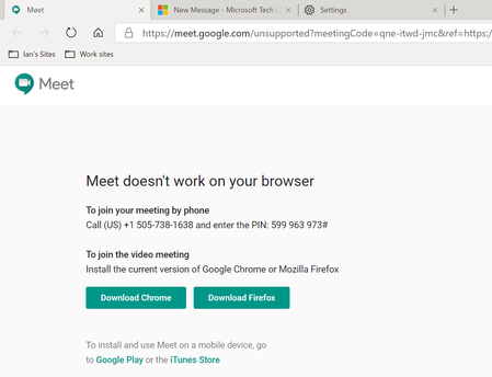 https://www.windowscentral.com/microsoft-edge-chromium-suddenly-stops-working-google-meetIt looks as if all that is needed is an addition to the collection of domains that work best with Chrome: