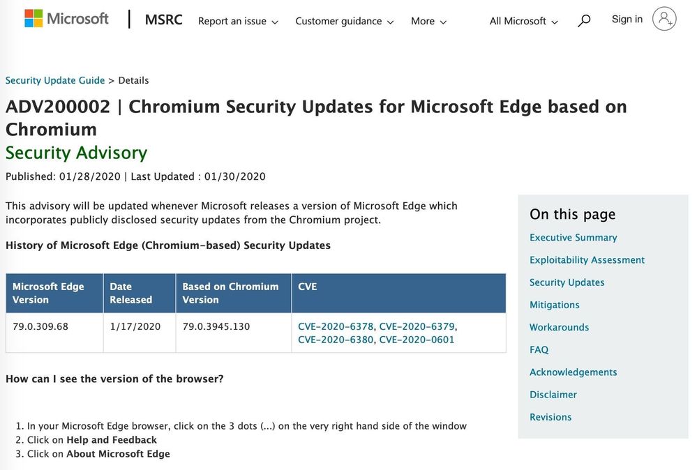 Microsoft has posted a security advisory that will record all updates to its new Chromium-based Edge browser, giving customers a way to monitor whether the company keeps up with Google's patching of Chrome.
