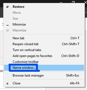 "--enable-features=WindowNaming" it will enable Window naming - although in stable it is a little inconsistent with carrying window names over after to close and re-open the browser.