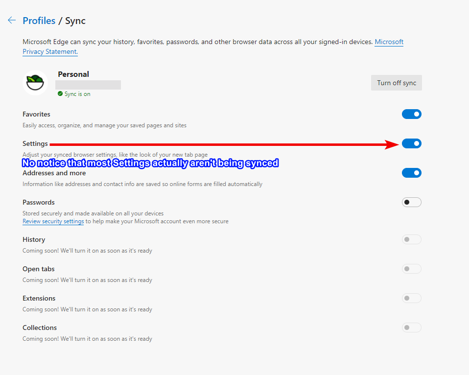 Totally agree, Settings sync also should be changed to "coming soon" status until it is fully covering all of the bits in Edge settings.