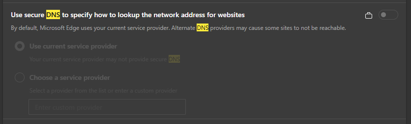 On managed browsers ["Your browser is managed by your organization"], the option to set DNS over HTTPS (DoH) is disabled on the Privacy, search and services page.