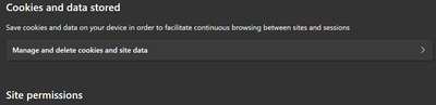 On a related note, please promote edge://settings/content/cookies to its own entry in the settings categories separate from site permissions to which it is insignificant enough to occupy only a small fraction of the top of the page logically and physically isolated from the site permissions. I admit that it may be me but I don't understand why these are combined at all, especially since the connection is reduced to something as tenuous as the single link below that results in two clicks required instead of one to get to the cookies page