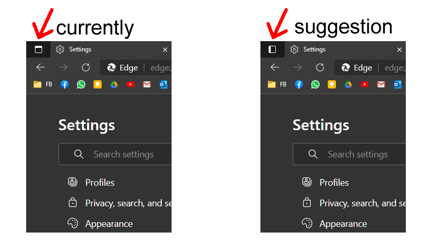 Hi, it doesn't seem clear to me what the icon design is trying to tell me. When I see a rectangle with a white stripe on top (in dark mode) I understand that if I click on the icon I will be switching to horizontal tab mode. For me, and I don't know if you interpret it the same way, the correct one would be the icon that appears in the image suggested above